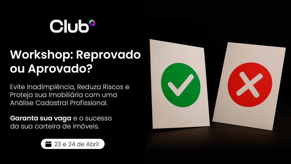 Foi justamente por enxergar esse cenário que a Club+ Br desenvolveu o Workshop: Reprovado ou Aprovado, um evento online e ao vivo, que acontecerá nos dias 23 e 24 de abril de 2025, voltado para corretores, donos de imobiliária, gestores de locação e administradores de imóveis que desejam elevar o padrão das suas análises cadastrais. Durante dois dias, os especialistas Luana Bandeira — advogada especialista em Direito Imobiliário — e Israel Brandão — mentor em gestão de locações e performance profissional — irão mostrar na prática como proteger juridicamente a análise cadastral da sua imobiliária, como montar um processo técnico e estruturado, e como tomar decisões com base em critérios defensáveis.